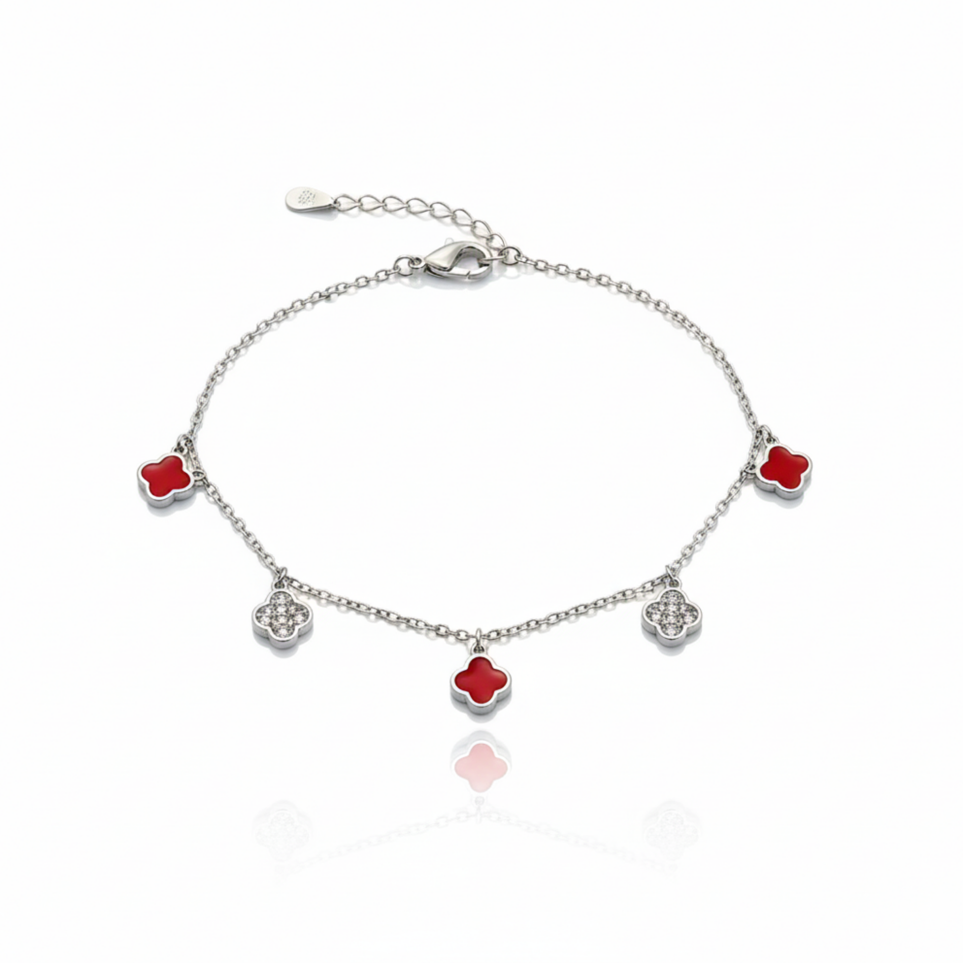 Add refined charm to your everyday style with the Scarlet Clover Bracelet, crafted from 925 sterling silver and designed with delicate clover motifs accented in rich red enamel and shimmering stones. The balanced detailing brings a graceful pop of colour while keeping the look elegant and timeless.